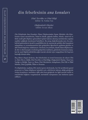 Din Felsefesinin Ana Konuları: İslam Düşüncesinden Seçme Metinler, din felsefesinin temel meselelerini, İslam’ın klasik çağında kelâm, felsefe, tasavvuf ve fıkıh usulü gibi düşünce gelenekleri içinde kaleme alınmış metinlerden yapılan seçkiler eşliğinde incelemeyi hedefliyor. Bu amaç doğrultusunda eser, bu entelektüel geleneklerin kendi iç çeşitliliklerini de yansıtacak şekilde dinî inançların anlaşılması ve yorumlanmasına dair geliştirilen öğretilerin açıklama gücüne ve aklî-felsefî değerine odaklanıyor. Derleme, bu yönüyle, klasik İslam düşüncesinde din ve dinî inançlar etrafında geliştirilen izahların, günümüz insanının arayışları ile nasıl ilişkilendirilebileceğini merak edenler için vazgeçilmez bir başvuru kaynağı olmaya aday.