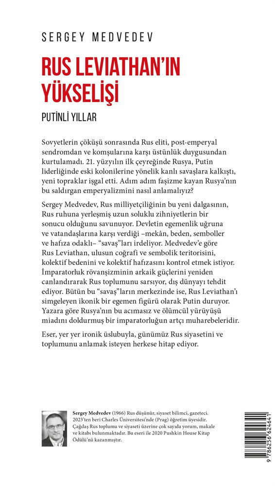Sergey Medvedev, Rus milliyetçiliğinin bu yeni dalgasının, Rus ruhuna yerleşmiş uzun soluklu zihniyetlerin bir sonucu olduğunu savunuyor. Devletin egemenlik uğruna ve vatandaşlarına karşı verdiği –mekân, beden, semboller ve hafıza odaklı– “savaş”ları irdeliyor. Medvedev’e göre Rus Leviathan, ulusun coğrafi ve sembolik teritorisini, kolektif bedenini ve kolektif hafızasını kontrol etmek istiyor. İmparatorluk rövanşizminin arkaik güçlerini yeniden canlandırarak Rus toplumunu sarsıyor, dış dünyayı tehdit ediyor. Bütün bu “savaş”ların merkezinde ise, Rus Leviathan’ı simgeleyen ikonik bir egemen figürü olarak Putin duruyor. Yazara göre Rusya’nın bu acımasız ve ölümcül yürüyüşü miadını doldurmuş bir imparatorluğun artçı muharebeleridir.